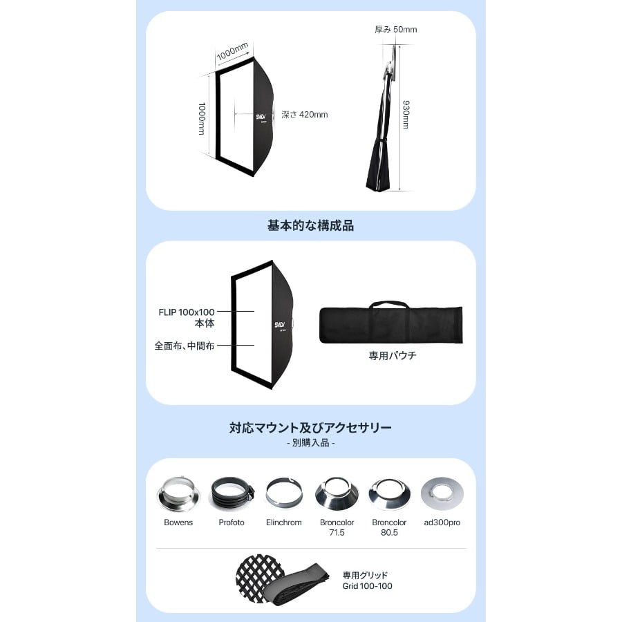 Flip Nemo は、Speedbox-Flip Gシリーズと同様に瞬間的なセットアップ機能を持ち、Bowens, Broncolor, Ellinchrome, Profoto, AD300Proマウントに対応。