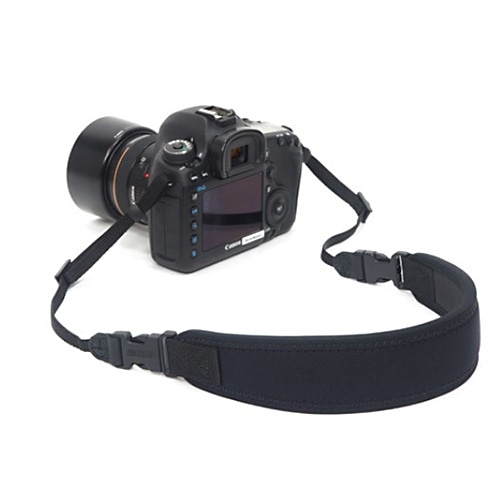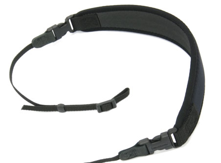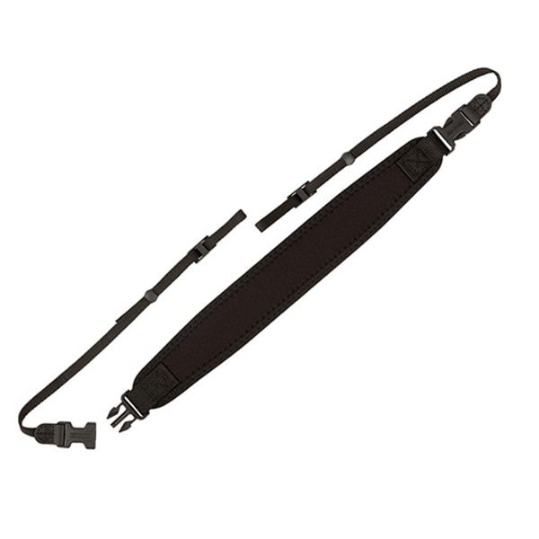 落ち着いたデザインで、大型AF一眼レフの重量に充分耐える強度を備えています。肩に当たる面には滑り止め生地を使用し、また生地を二重使いしているので、クッション性にも優れています。コネクターは「3/8インチウエビング」が標準装備されています。