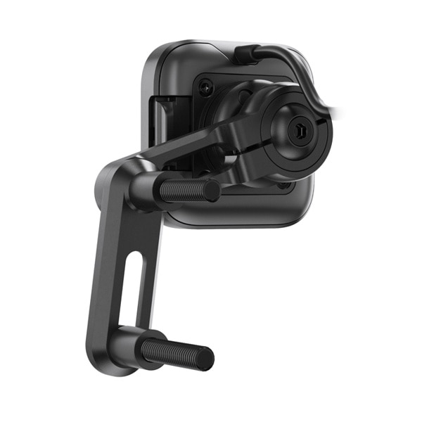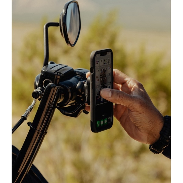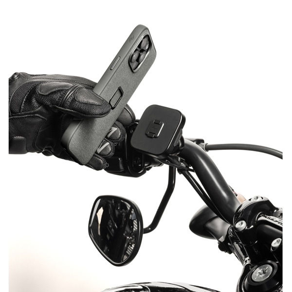本体は耐水性に優れた頑丈なアルミ製で、ヘッド部分の独自機構によりスマートフォンの揺れや振動を防止します。SlimLink™のハードロックによりしっかりとスマートフォンを固定し、取り外す際にはヘッド部分のプッシュボタンで簡単にロックを解除できます。バイク用グローブを装着した状態でも、スマートフォンの着脱が可能です。