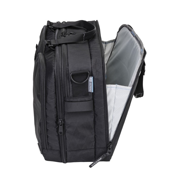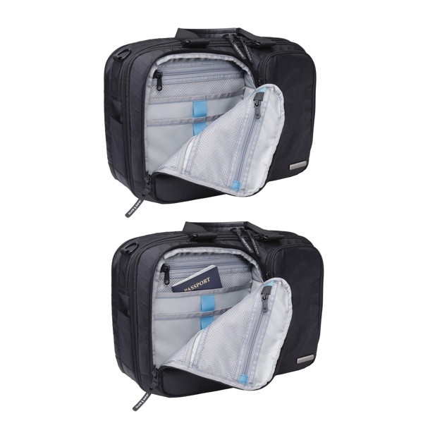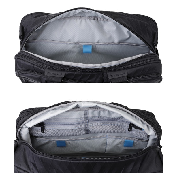 メインコンパートメントはダブルジッパーで大きく開き、さまざまなアイテムを収納できます。内部にはジッパー付きの小さなメッシュポケットが2つ、ベルクロで留められるポケットが大小合計3つ設けられています。さらに拡張用ジッパーを開くことで、メインコンパートメントの容量を5L増やせます。拡張時はバッグ内部の底部の仕切りを広げることができます。内部には明るい色の生地を採用し、暗い飛行機の中でもアイテムにアクセスしやすいデザインです。