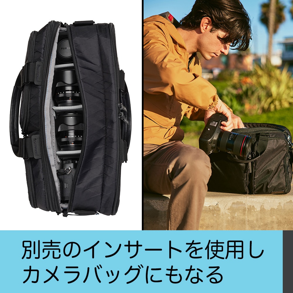 「チョベ 2.0」は、普段の通勤はもちろん、旅行にも使えるショルダーバッグです。バッグには20以上のポケットがあり、ノートPCやタブレット、モバイルバッテリー、日常的に使う雑貨やケーブルなどのアクセサリーの持ち運びに便利です。さらに別売のインサートをメインコンパートメントに収納すれば、カメラバッグとしての使用も可能です。
