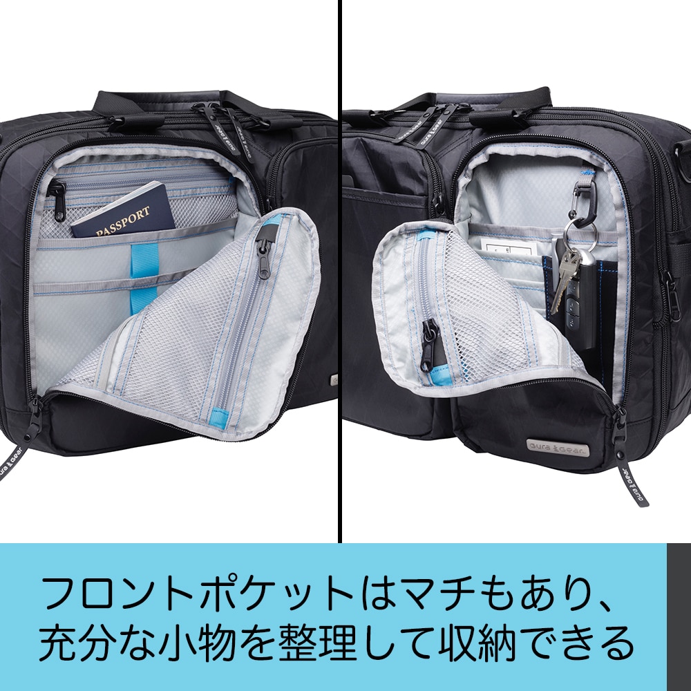 フロントポケットは大小2つが設けられ、細長いポケットにはメッシュポケット、オーガナイザーポケット、ペンホルダー、キーフックが備わっています。もう1つの大きなポケットには外側にはベルクロで留めるポケット、内部にはメッシュポケットやオーガナイザーポケットが設けられ、小物の収納に最適です。