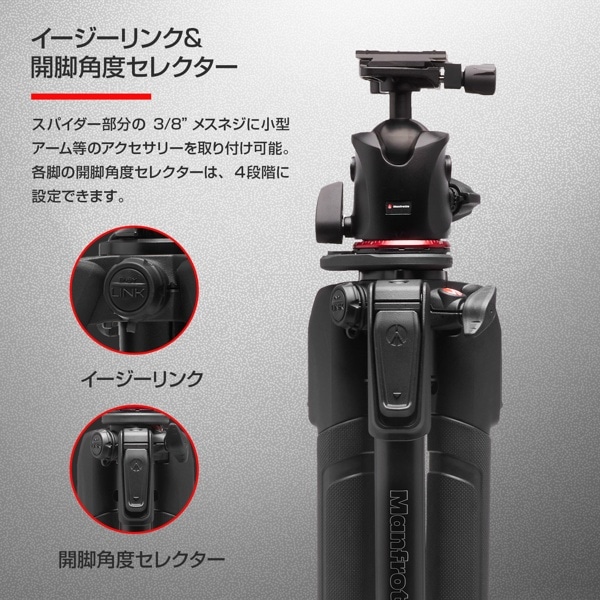 ライトやモニターを固定するための小型アームなどを装着できる “イージーリンク”機構を三脚本体に装備しています。これにより撮影システムを容易に拡張することができます。