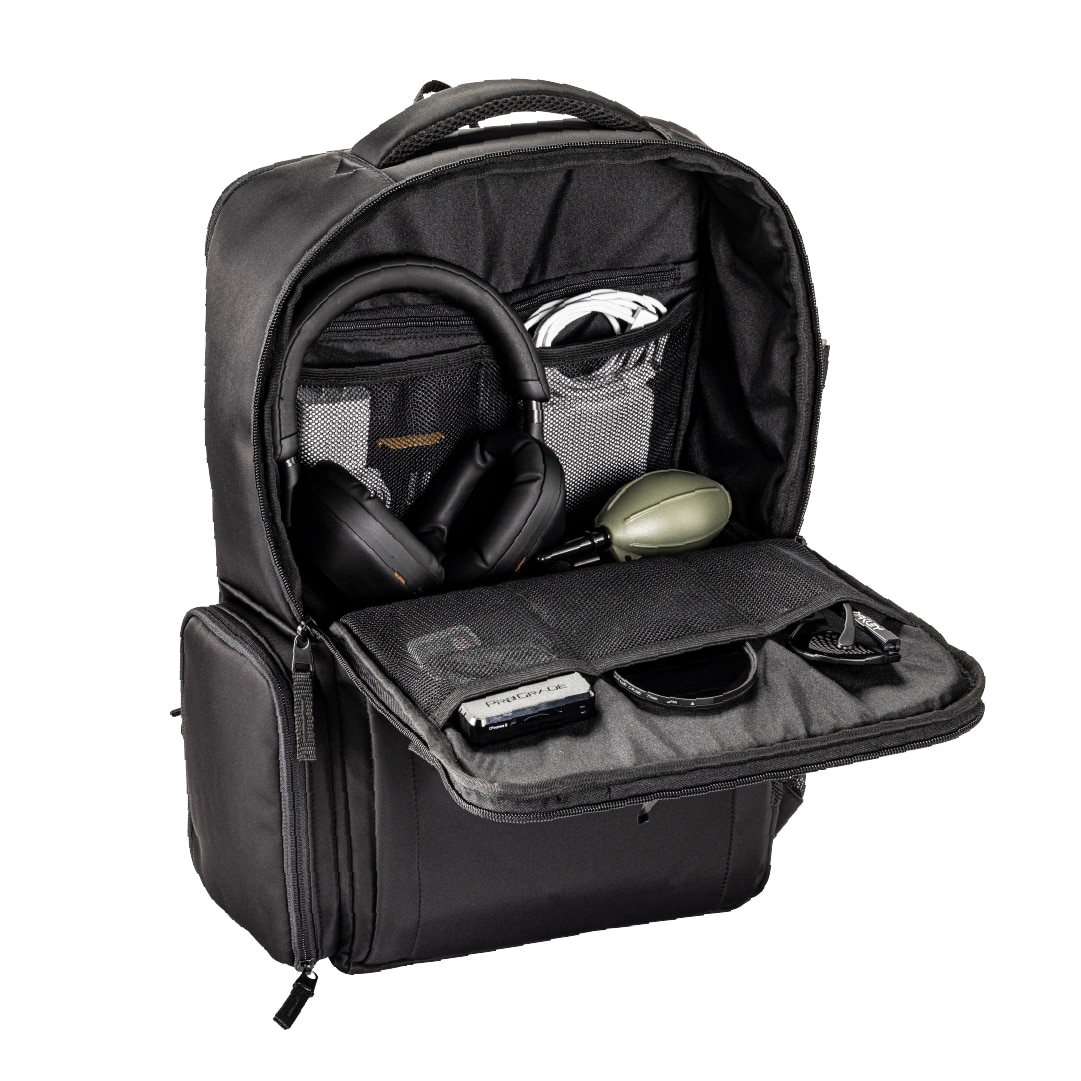 機能面では、機材を素早く取り出せる「サイドアクセス構造」のカメラ収納スペース(下段)と、日用品を自由に収納できるフリースペース(上段)の2気室構造を継承。機材を持ち歩かない日には、内部の仕切りを折りたたむことで、大容量のデイリーバックパックとしてもシームレスに活用可能です。