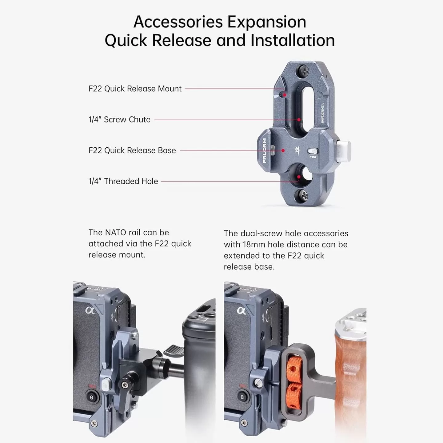 18?29mmの穴間隔に適応し、幅広いアクセサリーへ装着可能。標準1/4インチネジでカメラケージや各種マウントに取り付けでき、F22クイックリリースベースおよびマウントの拡張に対応します。