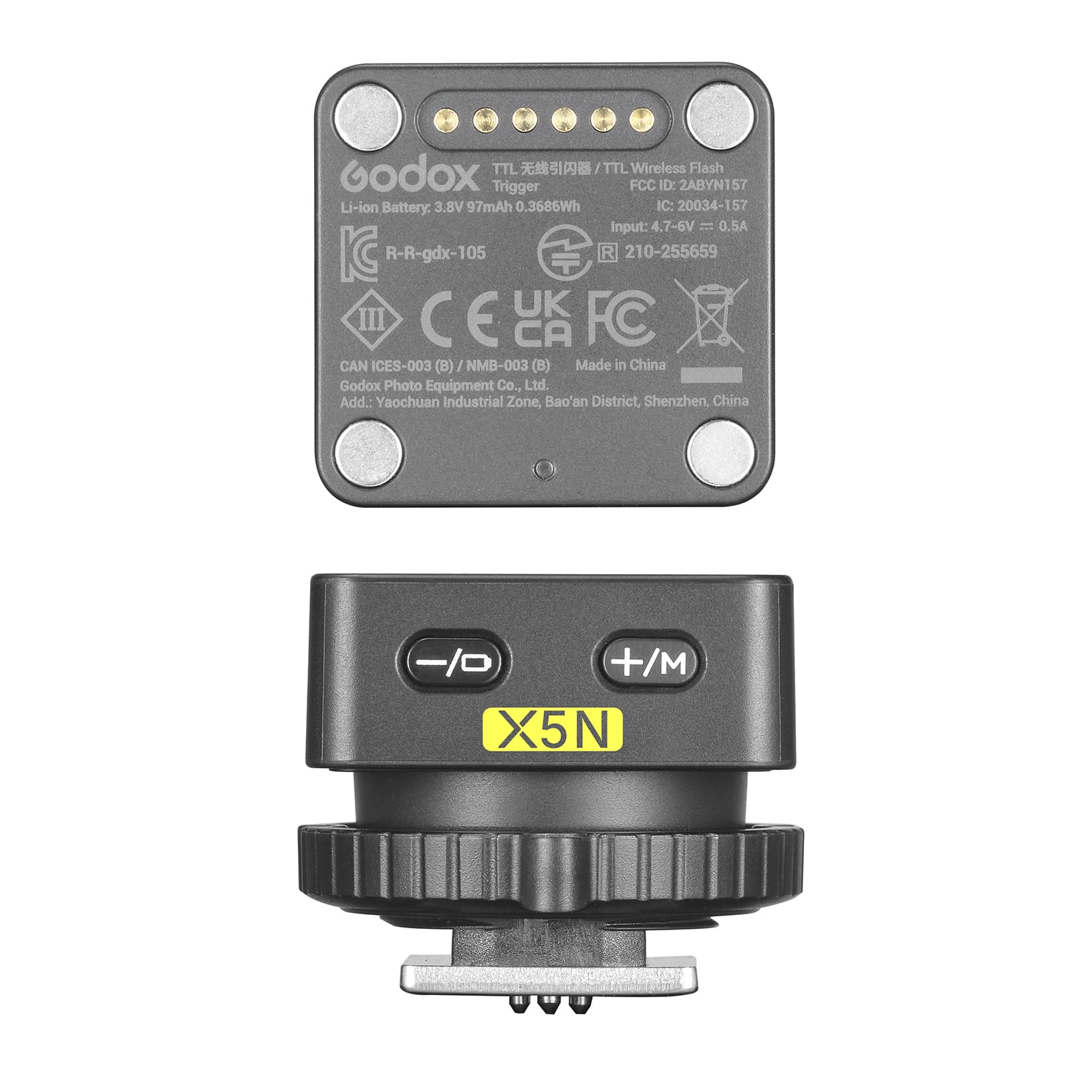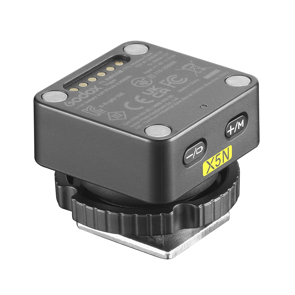 X5 は、iT32 のためのホットシューを兼ねた、TTL 対応ワイヤレストリガー(送信機)です。キヤノン、ニコン、ソニー、富士フイルム、OM/パナソニックの各メーカーTTL に対応しており、1 台の iT32 を複数メーカーのカメラで使用可能です。GODOX の 2.4GHz ワイヤレス「X」システムにより、iT32 および X5 は通常のクリップオンフラッシュとしてはもちろん、マスターユニットとして複数の X システム内の GODOX フラッシュを同時にコントロール可能にします。
