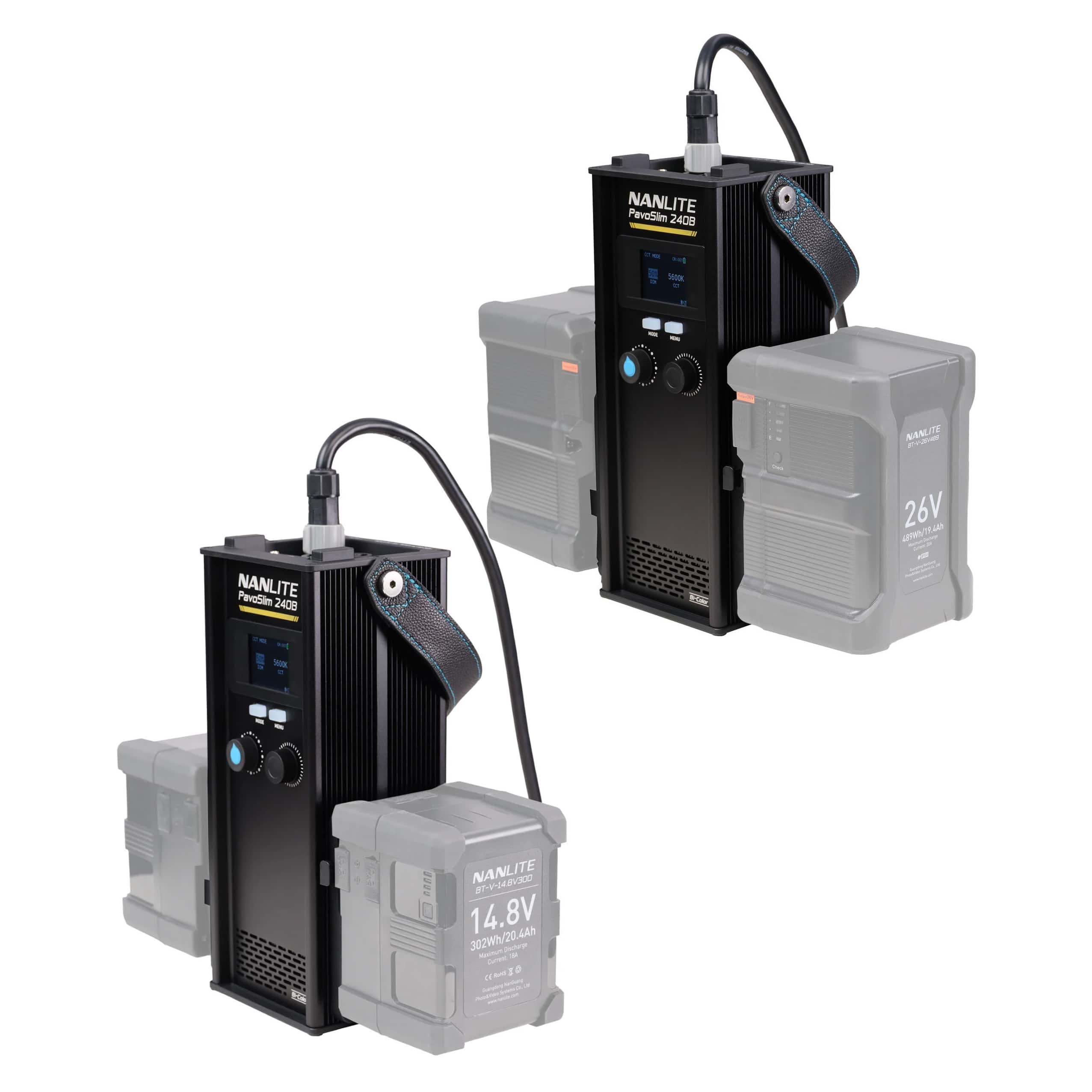 PavoSlim 240CはAC電源やDC電源、Vマウントバッテリーでの駆動にも対応。※14.4-14.8、26Vのバッテリーに対応。