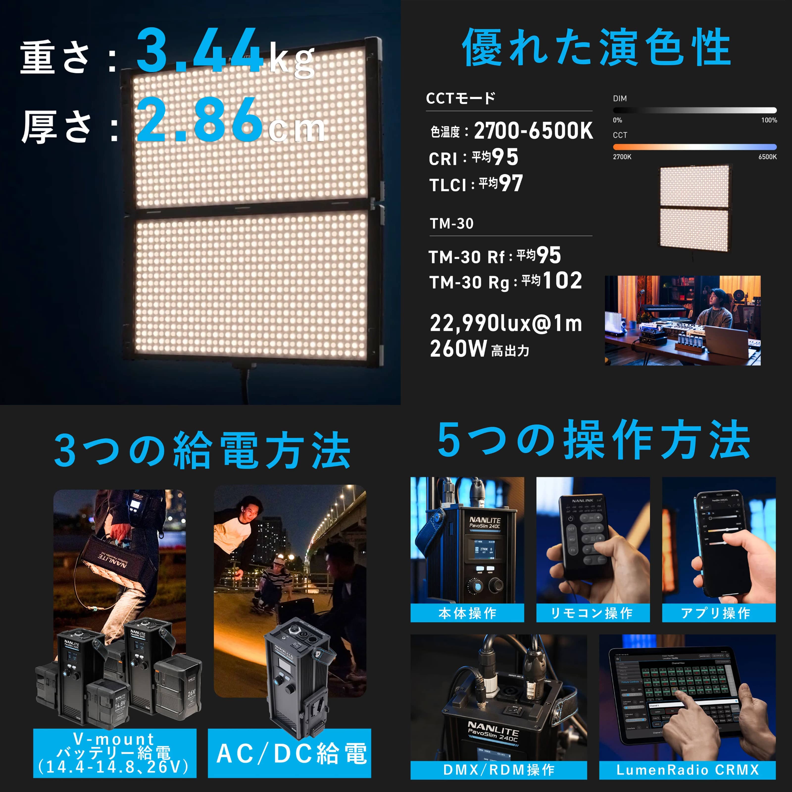 本体操作に加えて、アプリ操作、リモートコントローラー、2.4G、DMX/RDM、LumenRadio CRMX操作に対応。
