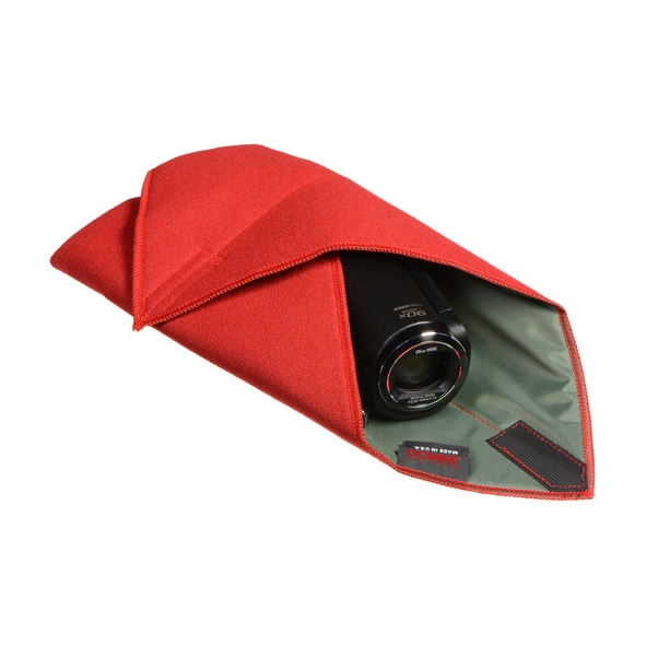 ドンケ製のカメラ用のプロテクティブ(protective=保護性)ラップ(wrap=包布)です。風呂敷状に裁断されたベルクロ(メス)生地を表に使い、裏は滑りの良いナイロンオックス生地、その間には2mm厚のウレタンクッション材が挟み込まれています。ラップの四隅にはベルクロのオステープが縫い付けられており、自由な大きさに畳んで留める事が出来ます。
