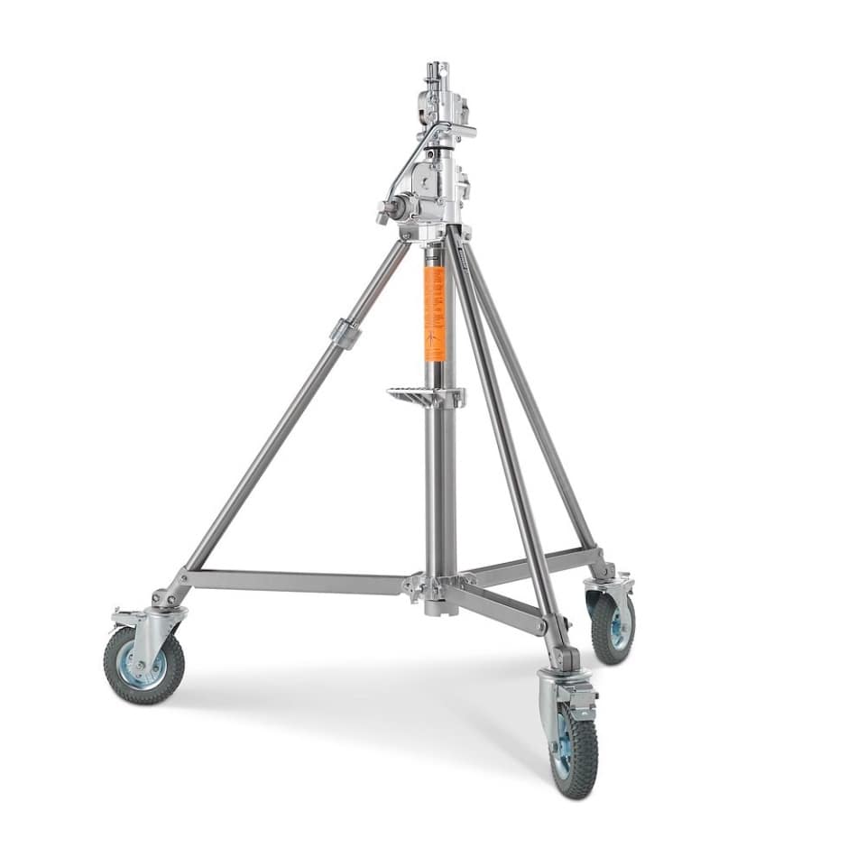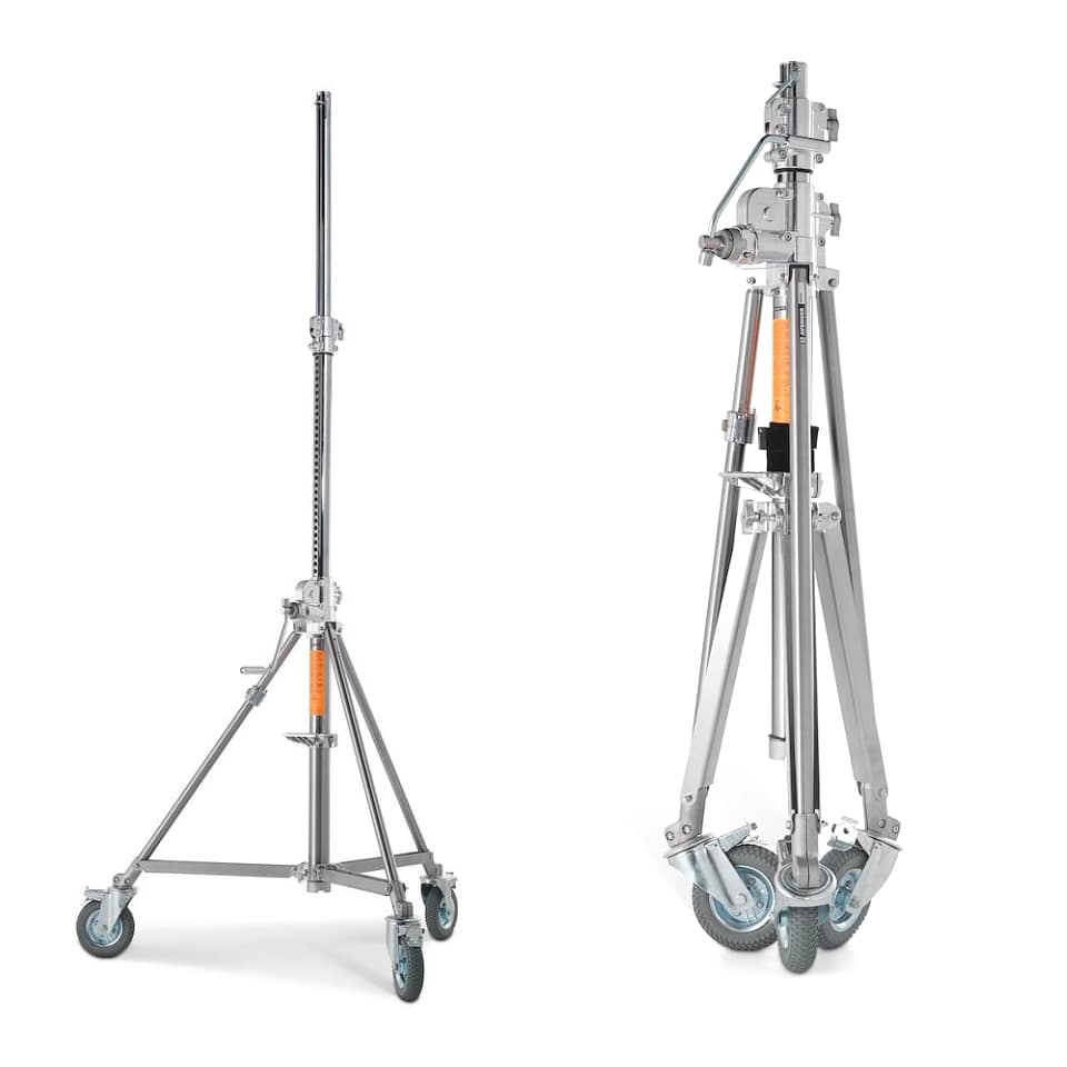 水平調整脚1本と不整地でもスムーズに移動できるブレーキ付き発泡ホイール(コード474)を備えています。最大80kgの機材を保持することができ、2.90mの高さまで伸ばすことが可能です。