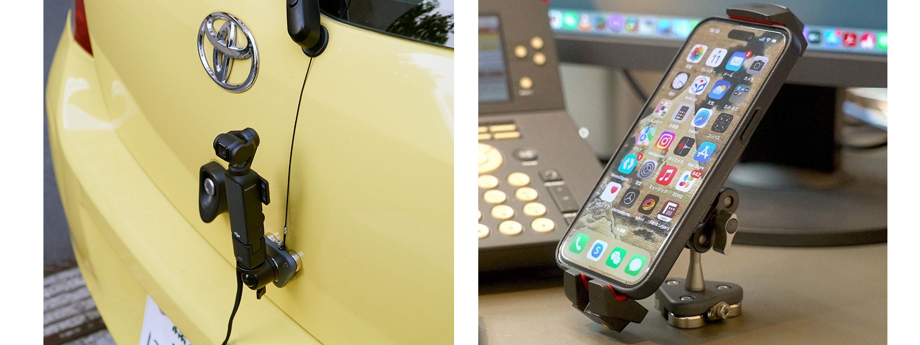 マグネットプレートに小型の自由雲台とアクションカメラを組み合わせたものを自動車に設置して撮影。