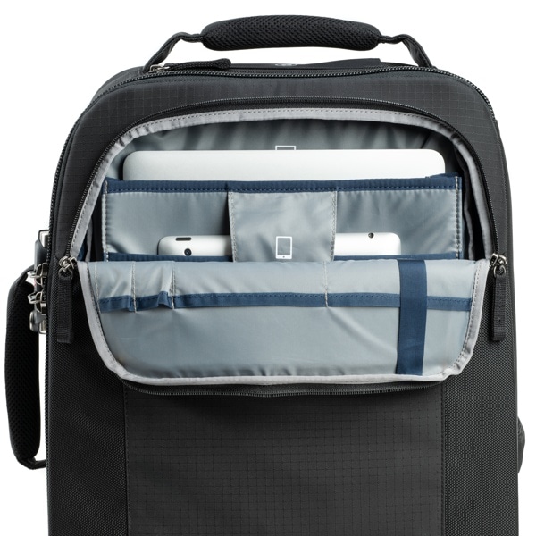 フロントパネルにはオーガナイザーポケットに加え、PC収納部として16インチノートPCとタブレットの専用ポケットが備えられています。また、内側のメッシュポケットにはアクセサリーなどの収納に便利なメッシュポケットが付いています。