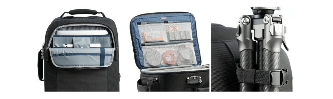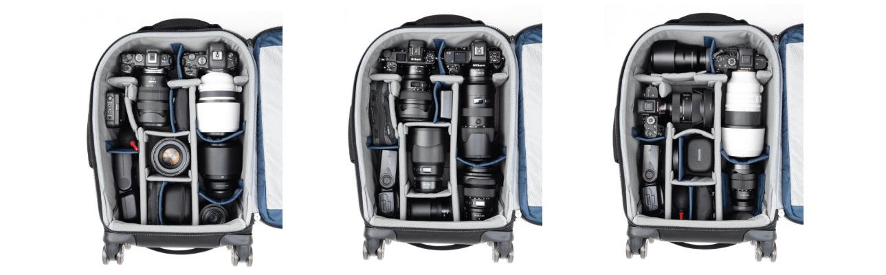 国内線100席以上の航空機に持ち込み可能なサイズで、レンズを装着したグリップ付き一眼レフ1台と中型一眼レフ1台、レンズ数本が収納できます。