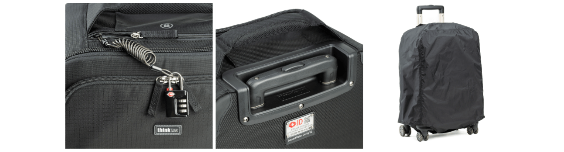 ノートPC用ポケットの開口部には南京錠などでロックをかけられるYKK® RC Fuseジッパーを採用し、盗難や不意の開閉を防止します。また、ケース背面のタグにはトラベルセントリー社の個別IDが記載されており、IDナンバーをトラベルセントリー社のページに登録しておくことで荷物の紛失時に役立つ場合があります(※)。さらに、防水性の高いレインカバーが付属しているため、急な天候変化からも機材を保護します。