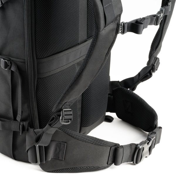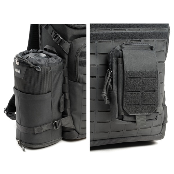 右側に設けられているサイドポケットにはウォーターボトルや三脚を収納可能で、さらに三脚等を固定できるバックル、アジャスター付きのコンプレッションストラップが付いており、安定した持ち運びを叶えます。