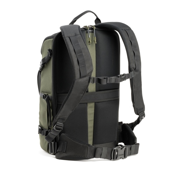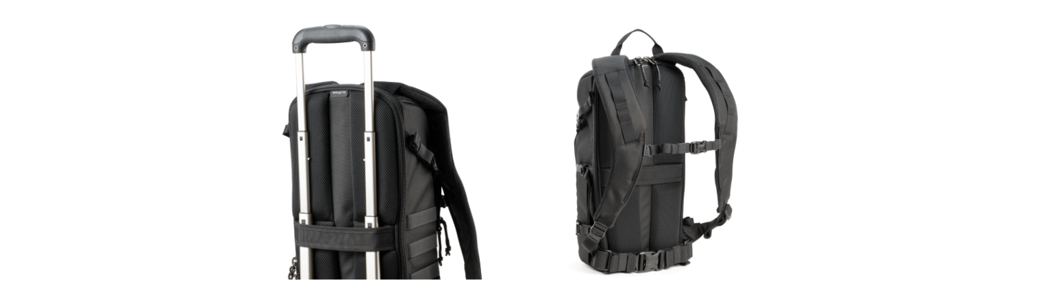 シンクタンクフォトの最新バックパック「ダークライト」は、都市部でも野外でも活躍する、写真撮影のための先進的なバックパックです。ウエストストラップを装着したままバッグを体の前面に回すことにより、バッグを下ろさずにバックパネルからメインコンパートメント全体にアクセスできます。ウエストストラップ(20Lはパッド入り、14Lはウェビング)は不要な際は取り外しも可能です。
