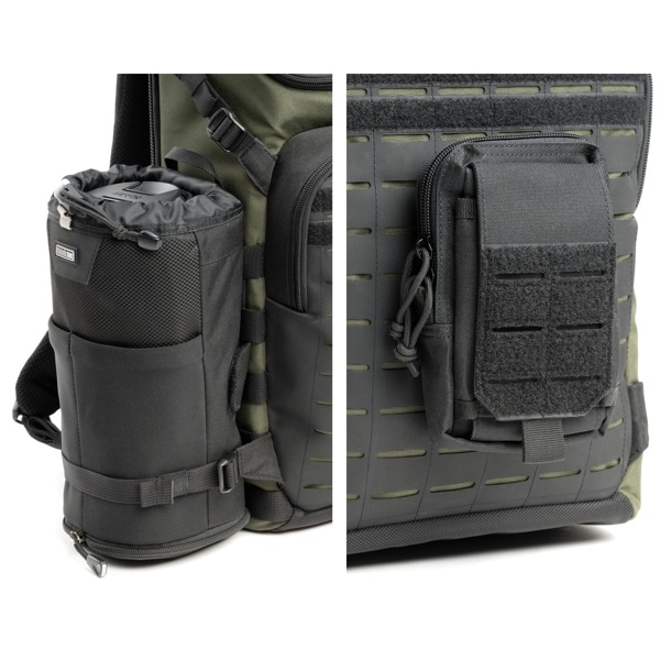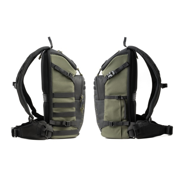 右側に設けられているサイドポケットにはウォーターボトルや三脚を収納可能で、さらに三脚等を固定できるバックル、アジャスター付きのコンプレッションストラップが付いており、安定した持ち運びを叶えます。