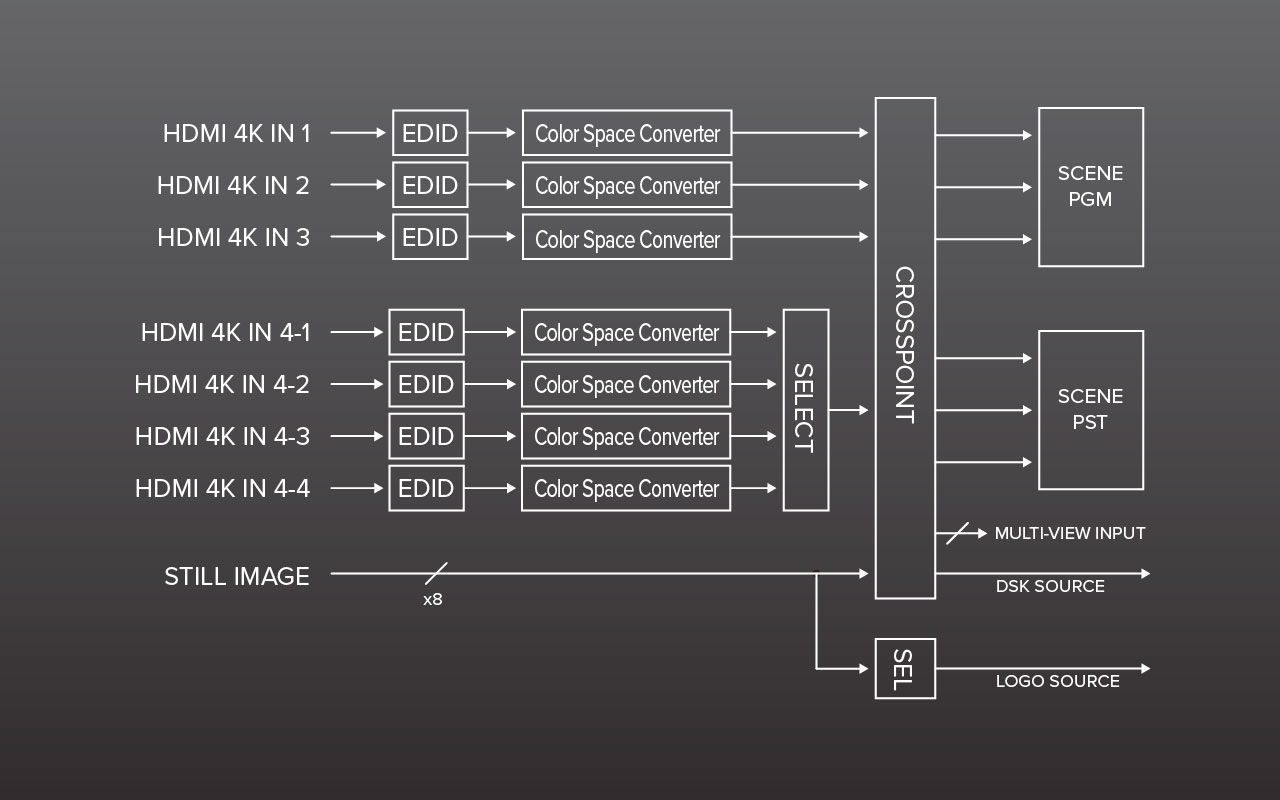 すべての入力にはスケーラーが内蔵されており、フォーマット変換を気にすることなく、4K/HD、HDR/SDR、Rec.2020/Rec.709のさまざまなデバイスを自由に組み合わせることができます。