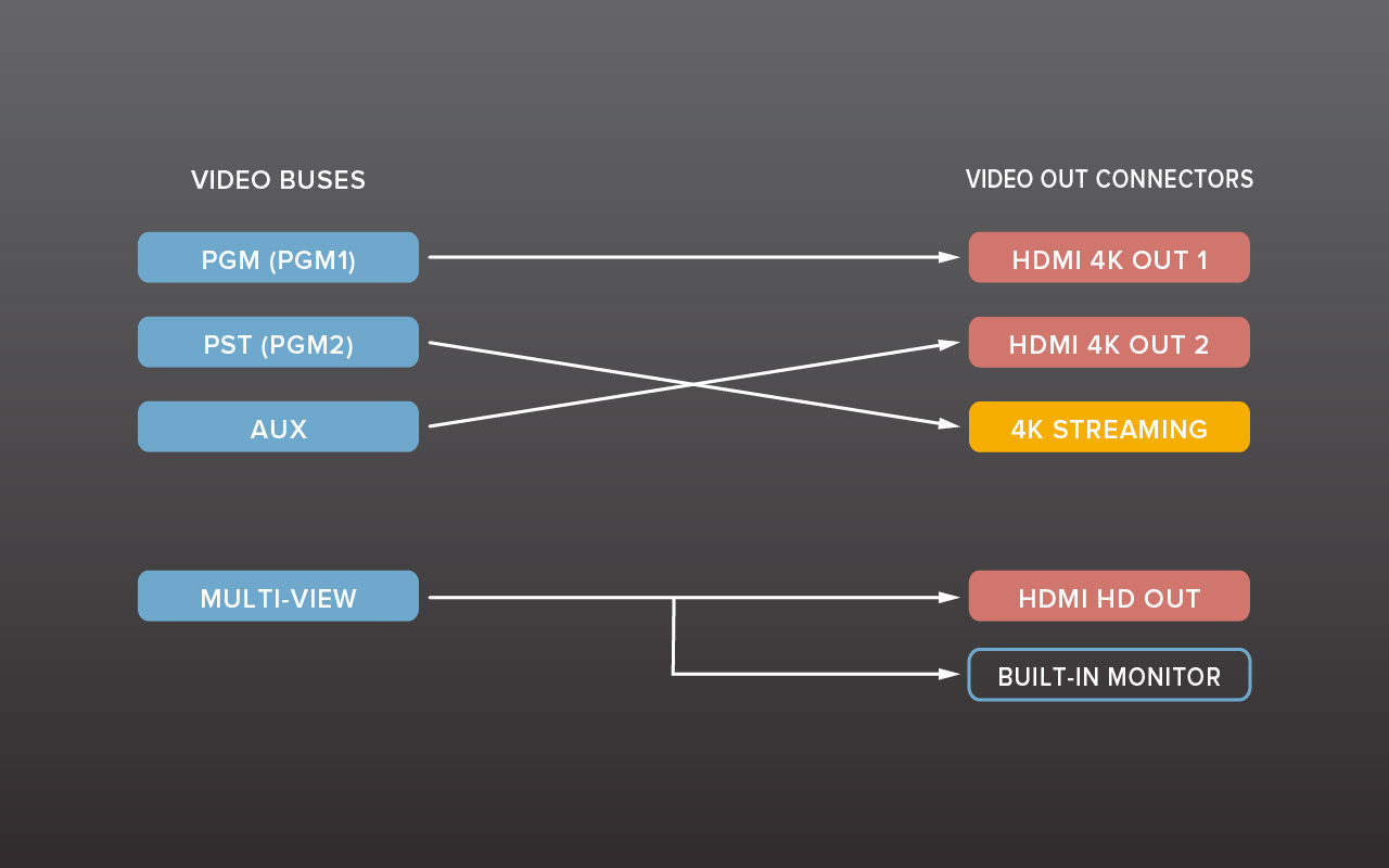 VR-400UHDは、4KからHDへのダウンスケーリング対応のHDMI出力を2系統備えており、それぞれにPGMまたはPSTを割り当てることができます。