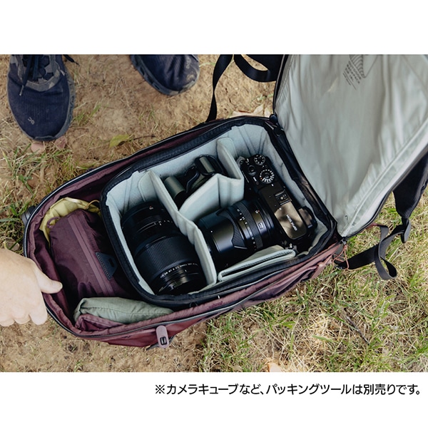 バリエーション豊かな別売りのピークデザイン製パッキングツールと組み合わせて、衣類や食料などを収納、携帯できます。また、カメラキューブ(※)を活用すれば軽量で機動性に優れたカメラバッグとしても使用できる、汎用性の良いバッグです。