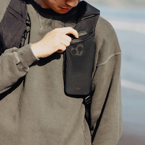 さらに、ショルダーストラップにスマートフォンやサングラスなどを収納できる小さなメッシュポケットと、ピークデザイン製キャプチャーカメラクリップを取り付けるスリットを設け、移動中でも必要なものを素早く取り出せる工夫が施されています。