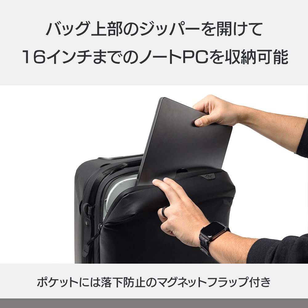 ローラー上部のエブリデイキャリーポケットは、ヘッドホンやメガネ、スマートフォンなど、頻繁に出し入れする小物の収納に便利です。また、マグネットフラップによるSnapTent™(落下防止機構)付きのノートPCスリーブ(※)と、アルミニウム製の丈夫なキーデザーも備えています。※16インチまでのノートPCを収納できます。