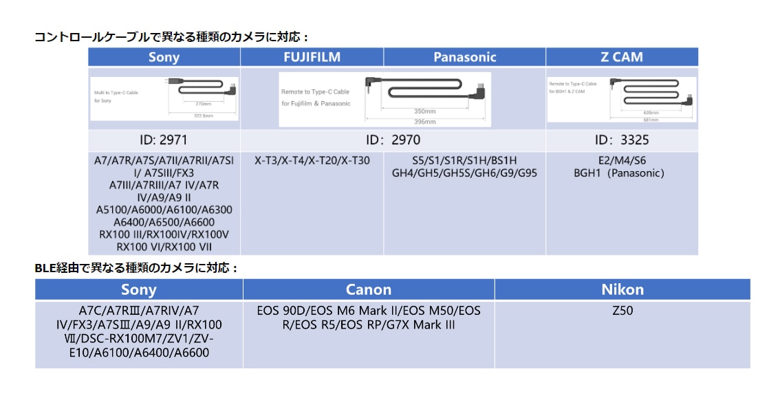 システムはまた無線 REC のビデオ録画の開始/停止を達成するために BLE モジュールを通してカメラに直接接続され別のインターフェイスのアダプター ケーブル(ID: 3325・2971・2970 でモデルにより異なる)の焦点モーターに続くために無線制御を達成できます。