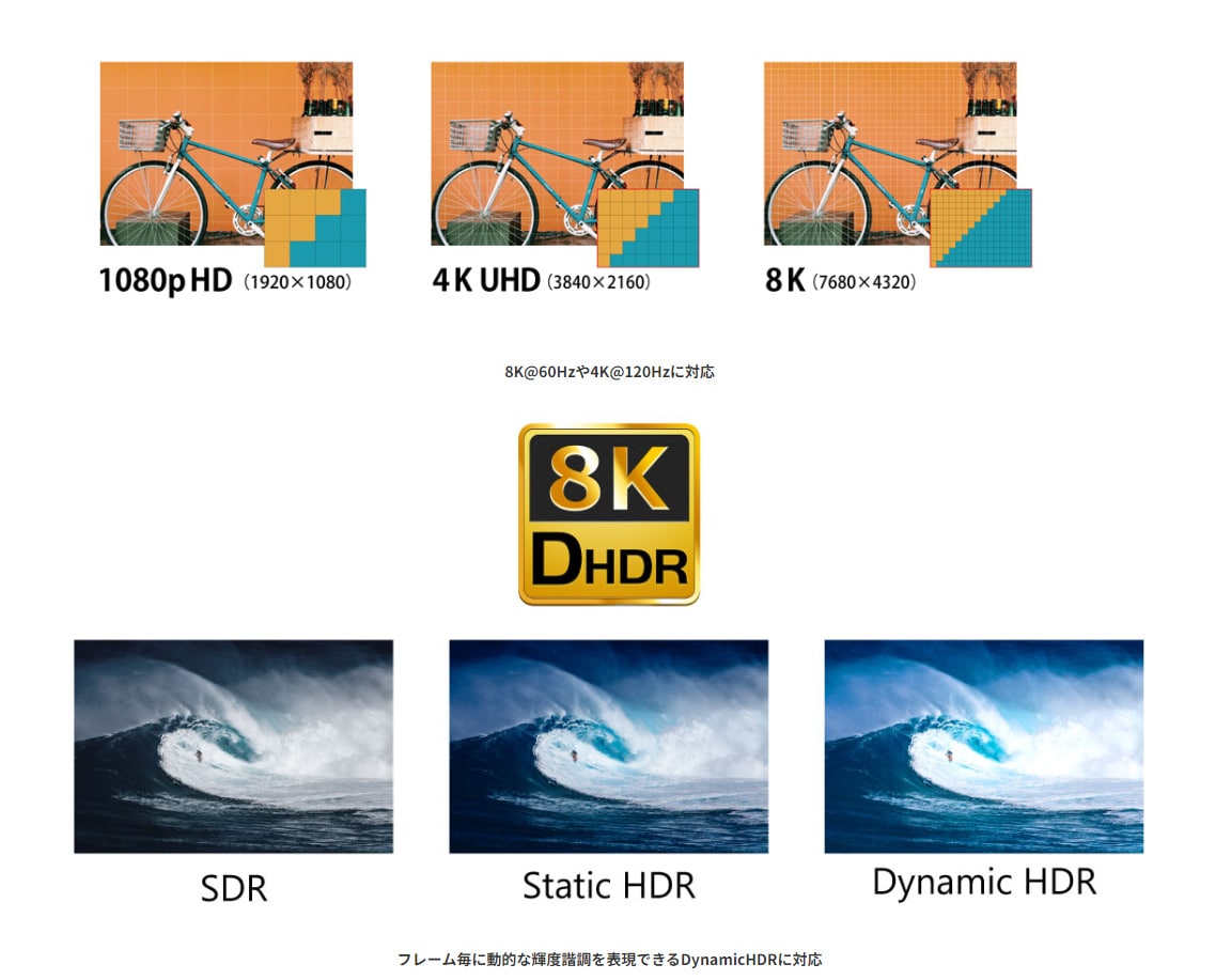 | 最大解像度 | 8K60Hz / 4K120Hz | ||