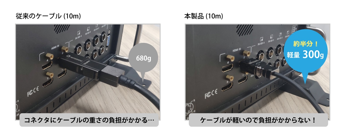 同じ長さの銅線ケーブルや従来のアクティブケーブル(10m約680g)と比較しても軽量(10m約300g)で持ち運びしやすく、かつ柔らかなケーブル(最小許容曲げ半径38mm)なので、設置時のシンク機器側コネクタへの負担が少なく済みます。※2)