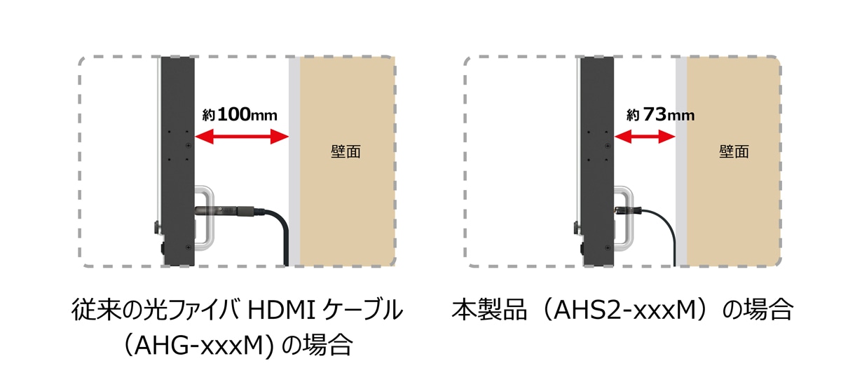 コネクタ部分も奥行きわずか35mmの超コンパクト設計。従来のアクティブケーブルからは考えられない程小さく、壁際設置された機器への利用にも最適です。