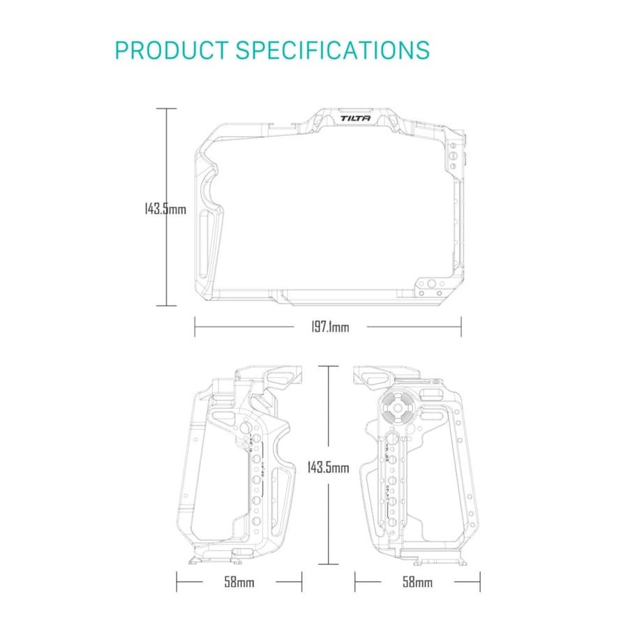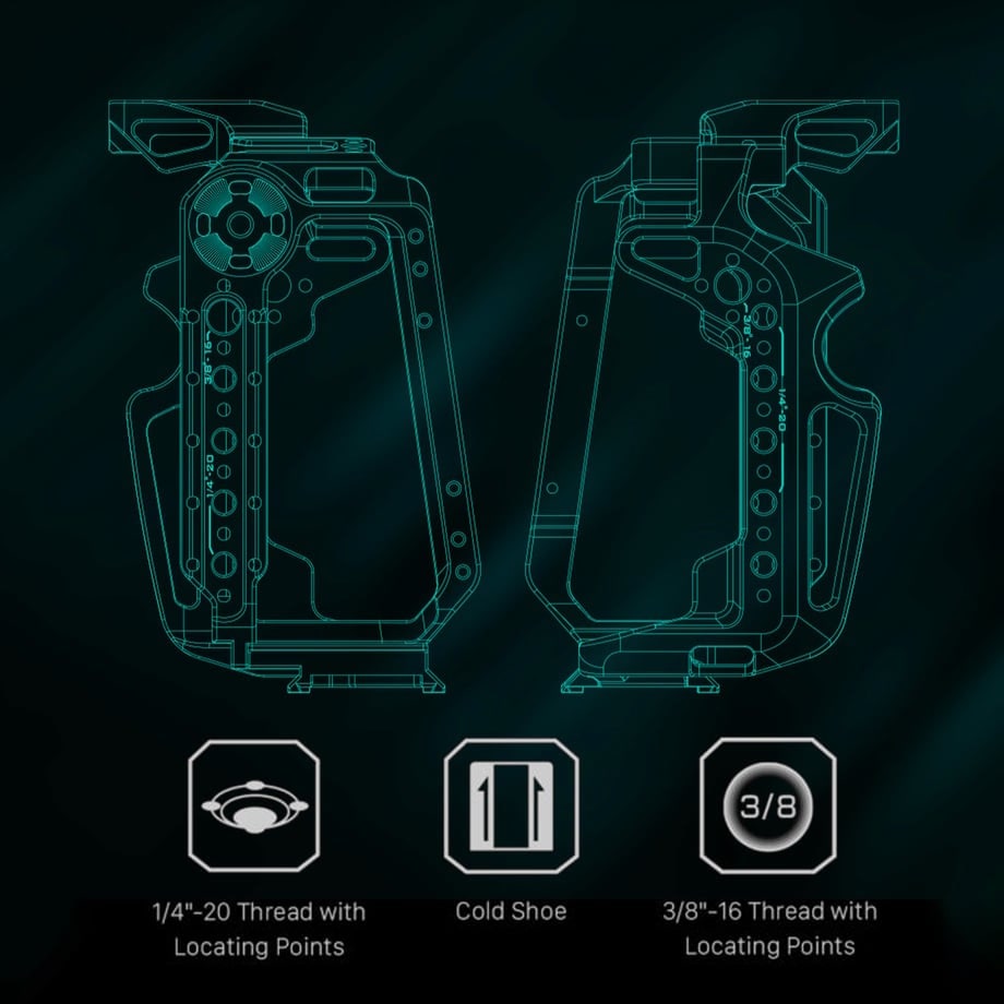 フルケージには、位置決めポイント、コールドシューレシーバー、Arri互換のロゼット、NATOベースのサイドハンドルやアクセサリー用のNATOレールを備えた1/4"-20のネジがあります。