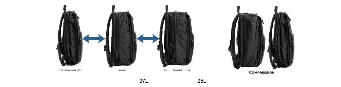 圧縮可能なデザインを採用しており、両サイドの上下に備わるストラップで厚みを調整でき、荷物量に合わせて圧縮できます。
