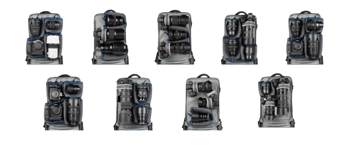 ボディやレンズ単体はもちろん、レンズを装着したカメラを収納できる設計で、柔軟で合理的なパッキングができます。