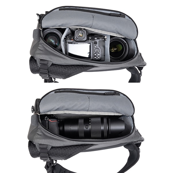 バッグを背中から前面へ素早く回転させるだけで、サイドパネルから機材を取り出せる「スウィングアクセス構造」を採用。バッグを地面に下ろす手間を省き、決定的なシャッターチャンスを逃しません。