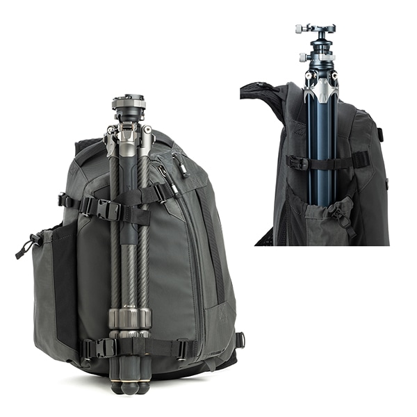 メイン開口部にはYKK製止水ファスナー(AquaGuard®)を採用.本体素材には、環境に配慮したPFASフリーの耐久撥水(DWR)コーティングを施し、シームレスなCORDURA®(コーデュラ)ナイロン製のベースおよびフロントパネルを組み合わせています。また、悪天候時に機材を完全に保護するシームシール処理済みレインカバーも標準装備しています。