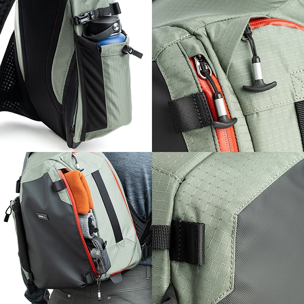 メイン開口部にはYKK製止水ファスナー(AquaGuard®)を採用.本体素材には、環境に配慮したPFASフリーの耐久撥水(DWR)コーティングを施し、シームレスなCORDURA®(コーデュラ)ナイロン製のベースおよびフロントパネルを組み合わせています。また、悪天候時に機材を完全に保護するシームシール処理済みレインカバーも標準装備しています。