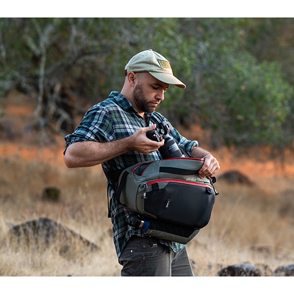バッグを背中から前面へ素早く回転させるだけで、サイドパネルから機材を取り出せる「スウィングアクセス構造」を採用。バッグを地面に下ろす手間を省き、決定的なシャッターチャンスを逃しません。