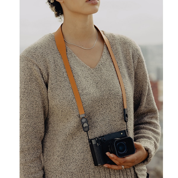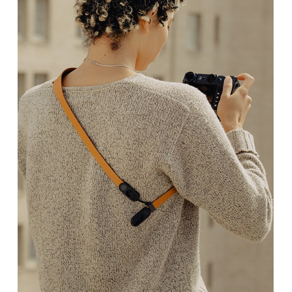 ストラップの裏側には独自のシーリング加工が施され、体に沿ってスムーズに動きながらも、肩から簡単にずり落ちない適度なグリップ力を持っています。レザーの端部分は、薄型のガラス強化ナイロン製アンカーハウジングにシームレスに結合されており、安全かつ簡単にカメラを着脱できます。