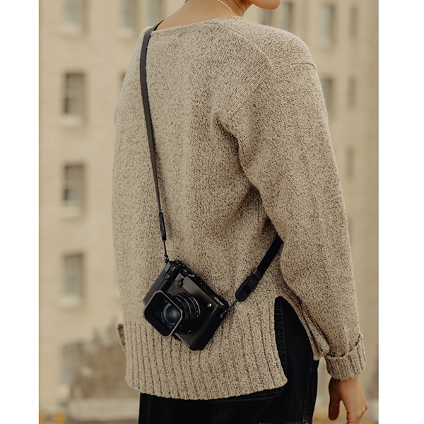 ストラップの裏側には独自のシーリング加工が施され、体に沿ってスムーズに動きながらも、肩から簡単にずり落ちない適度なグリップ力を持っています。レザーの端部分は、薄型のガラス強化ナイロン製アンカーハウジングにシームレスに結合されており、安全かつ簡単にカメラを着脱できます。