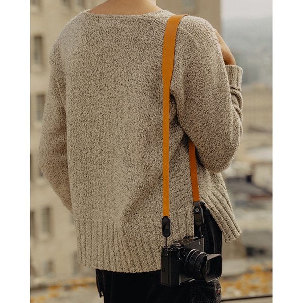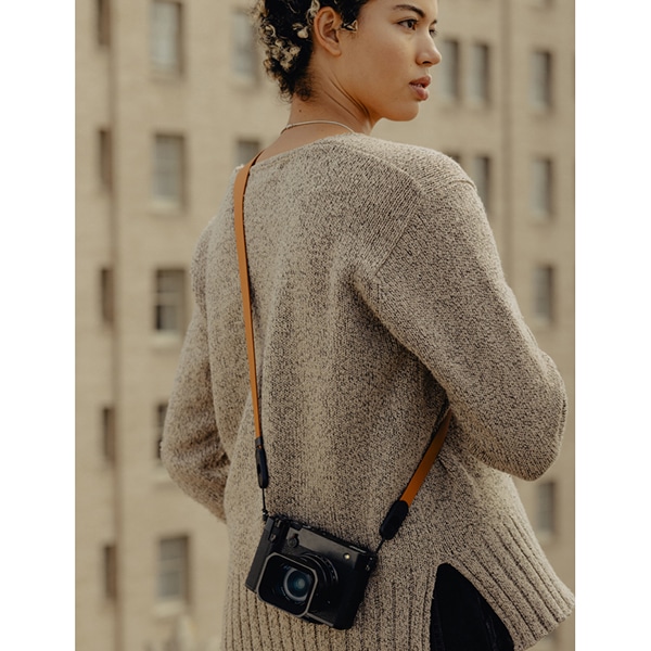 「フォーム レザー」は、ミニマルでかさばらないシンプルなカメラストラップです。柔らかく耐久性に優れ、経年変化を楽しめる上質なフルグレインレザー(牛革)を使用。目に見える縫い目などを削ぎ落とし、時代を超えて愛されるクリーンな外観と使用感を実現しました。
