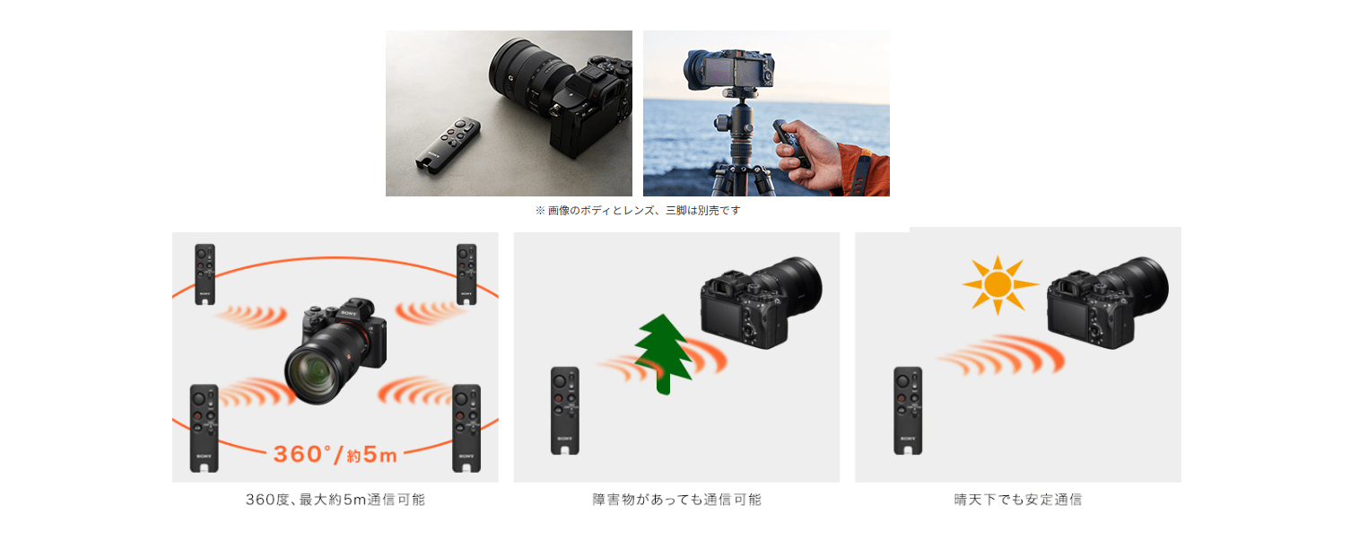 リモートコマンダー 「RMT-VP2」は、ソニー製カメラ(*1)とBluetooth(R)で通信するため、赤外線通信よりも安定した接続を実現。カメラの操作や動画・静止画のリモート撮影が可能となり、撮影の自由度が広がります。無線通信距離は約10m(*2)で、快適なリモート撮影を実現します。