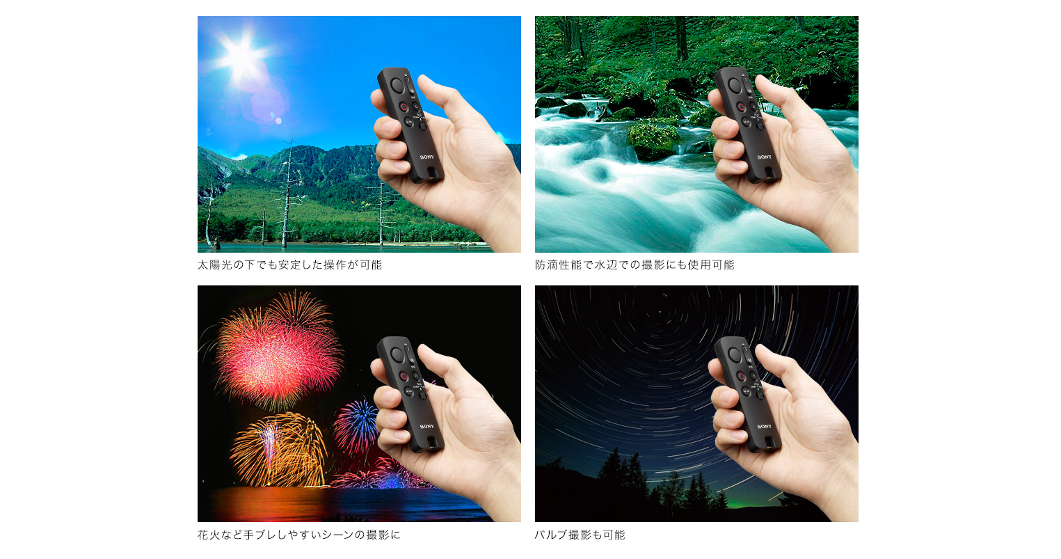 「RMT-VP2」は、防塵・防滴仕様(*)を採用しており、あらゆる撮影環境に対応します。さらに、カメラにケーブルや受信機を接続する必要がないため、カメラ本体の端子カバーを開ける必要がなく、リモートコマンダー自体の防塵・防滴性能が向上しています。