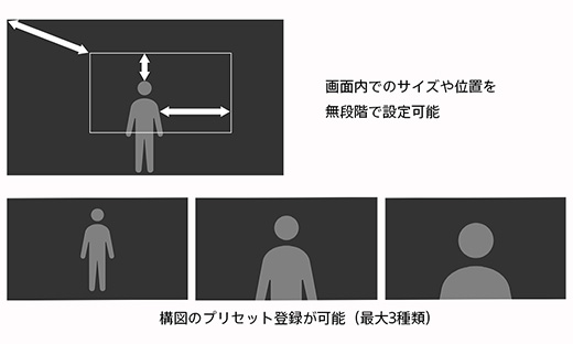 全身サイズからクローズアップ(バストショット)まで無段階での構図調整機能や、カメラの構図をあらかじめ登録して呼び出せる構図プリセット機能など、PTZオートフレーミング機能の使い勝手を大きく向上させるさまざまな機能を搭載しています。