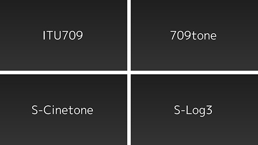 標準規格である「ITU709」やソニー業務用カメラの分光特性に沿った「709tone」、シネマカメラに近い色味を再現する「S-Cinetone」など、あらかじめ用意されたシーンファイルを使い好みのルック(*)で撮影できます。また、S-Log3にも対応しHDR撮影も可能です。
