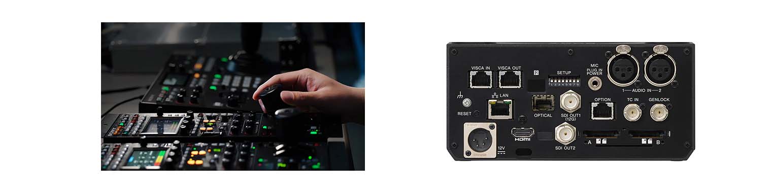 ・映像出力端子:12G-SDI/3G-SDI/光ファイバー(SFP+)・音声入力端子:XLR-3ピンx2、3.5mmステレオミニジャック