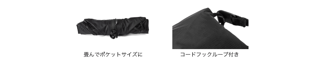 薄く軽量な素材を採用しかさばらないため、荷物の多い旅行でも限られたバッグのスペースを効率的に活用できます。使用しないときは、たたんでジッパーコードで留めることでポケットサイズになり、バッグに常備しておけば外出先で活躍します。