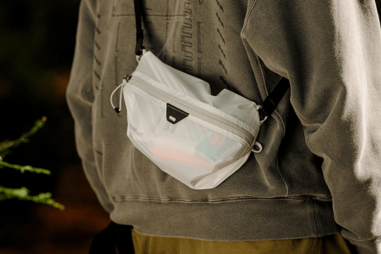 ポーチ上部のコードフックループに別売りのピークデザイン製ストラップや「フラットフックストラップ」を取り付けるだけで、超軽量なスリングバッグとしても活用できます。必要なものだけをまとめてそのまま持ち出せるので、旅先でのちょっとした外出時に便利です。