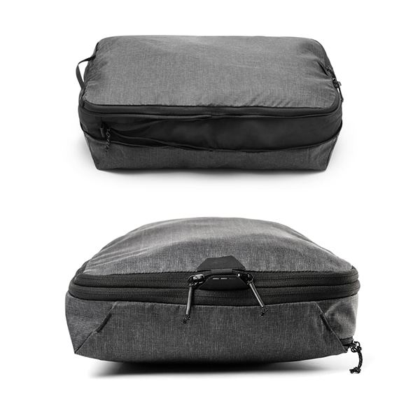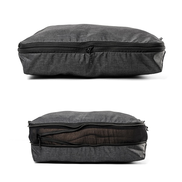 ピークデザインの「パッキングキューブ」は、衣類などの収納に適したポーチです。内部仕切りによって清潔な服と汚れた服を分けることができ、内容量に応じてサイズを調節できます。