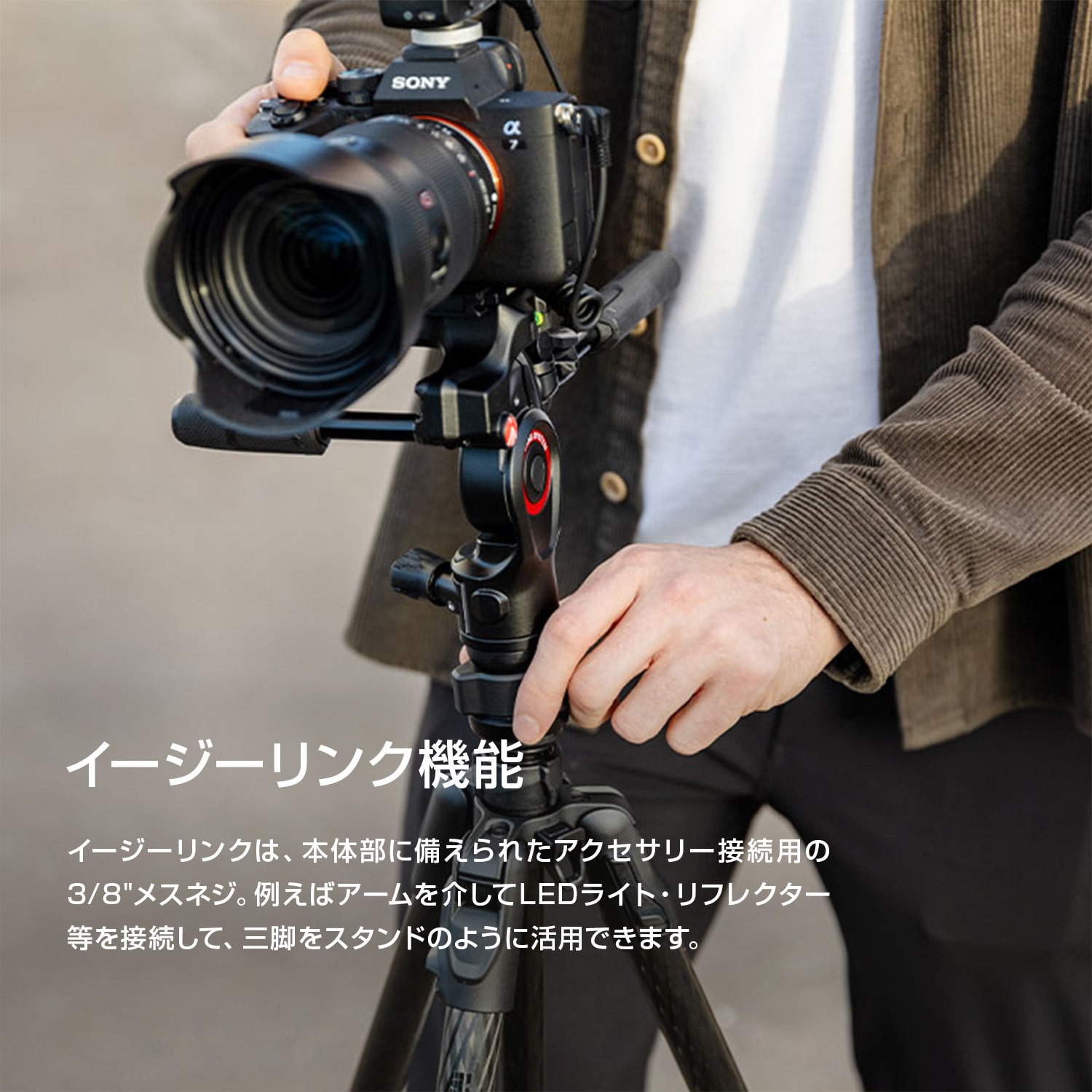 また三脚のスパイダー部分には、小型アームを介してライトやモニターといった外付けアクセサリーを取り付けられる 3/8”ネジの“イージーリンク”が搭載されています。