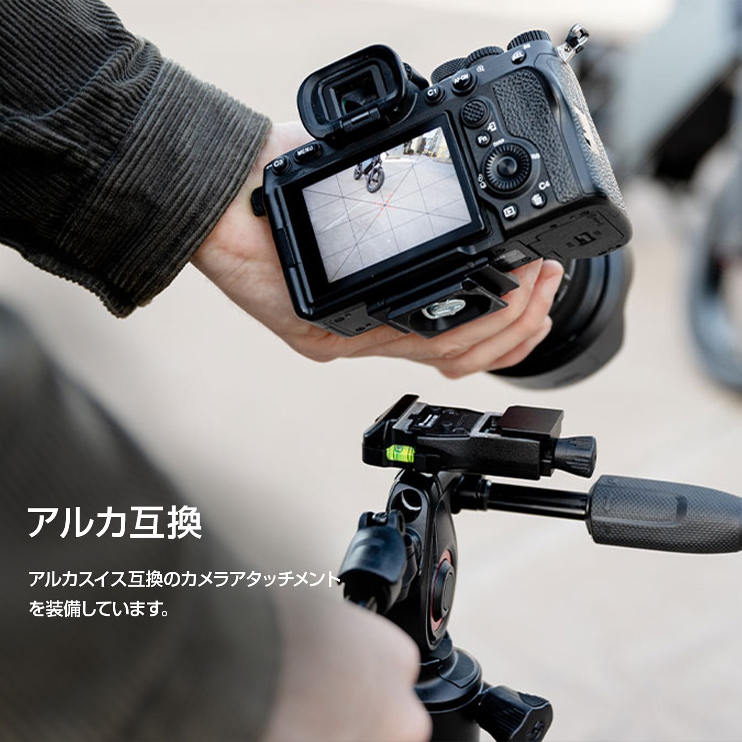 ■ すっきり収納できる折りたたみ式のパン棒。アルカスイス互換プレートも使える 3 ウェイ雲台